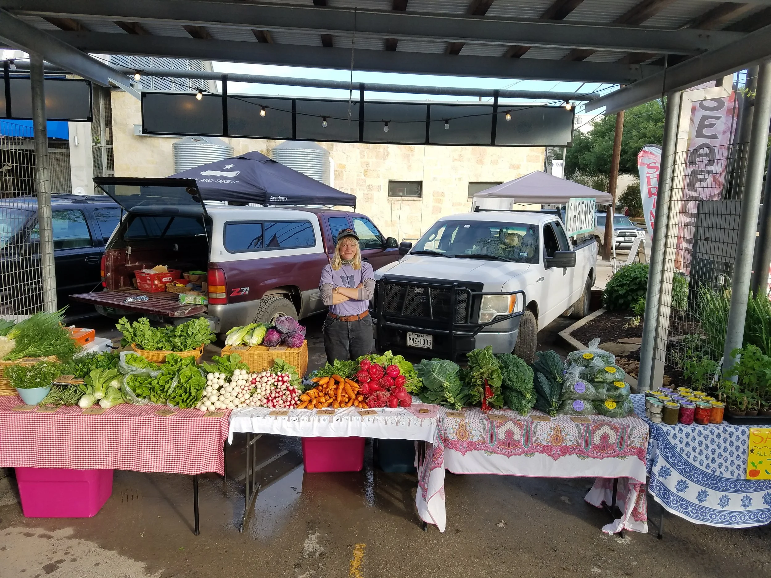 We sell a wide variety of seasonal vegetables, fermented goods like kimchi and sauerkraut, herb salt mixes, microgreens, and eggs from our flock of well loved, free range chickens.